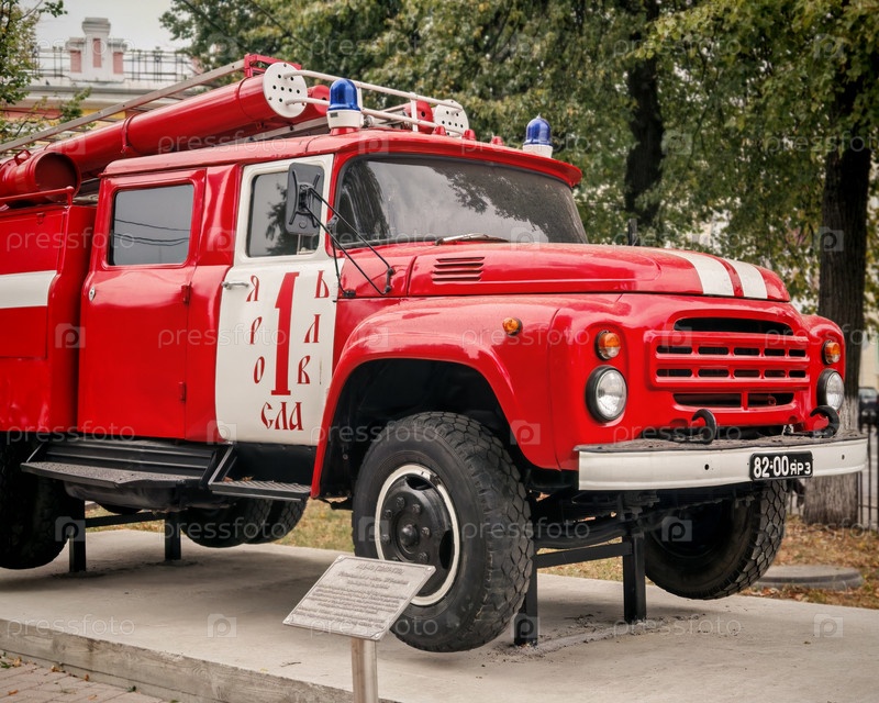 Памятник пожарной машине на территории пожарной части крупным планом (Красная Площадь, Ярославль)