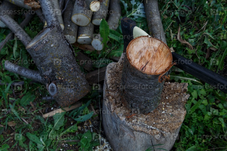 Спил вишневый ствол Sawn cherry tree trunk and axe