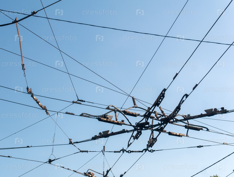 Промышленный городской фон, переплетение кабелей над улицей на пересечении контактных проводов троллейбуса