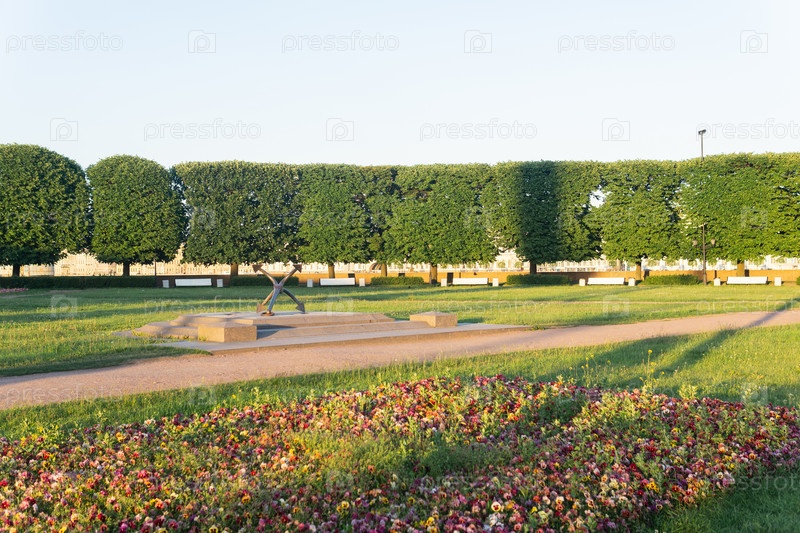 Фон, прибрежный парковый пейзаж с дорожками, скамейками и старым якорем на постаменте