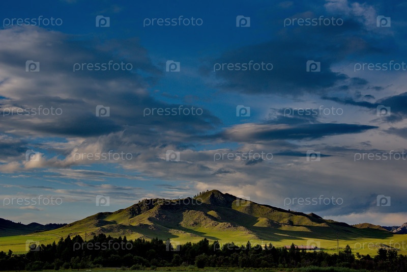 Россия. Горный Алтай. Живописное закатное небо над скалистыми горами возле поселка Усть-Кан