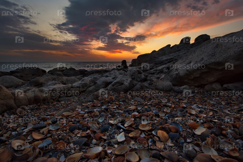 Россия. Дагестан. Рассвет на усыпанном ракушками скалистом берегу Каспийского моря недалеко от городской набережной Махачкалы