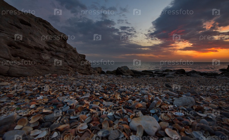 Россия. Дагестан. Рассвет на усыпанном ракушками скалистом берегу Каспийского моря недалеко от городской набережной Махачкалы