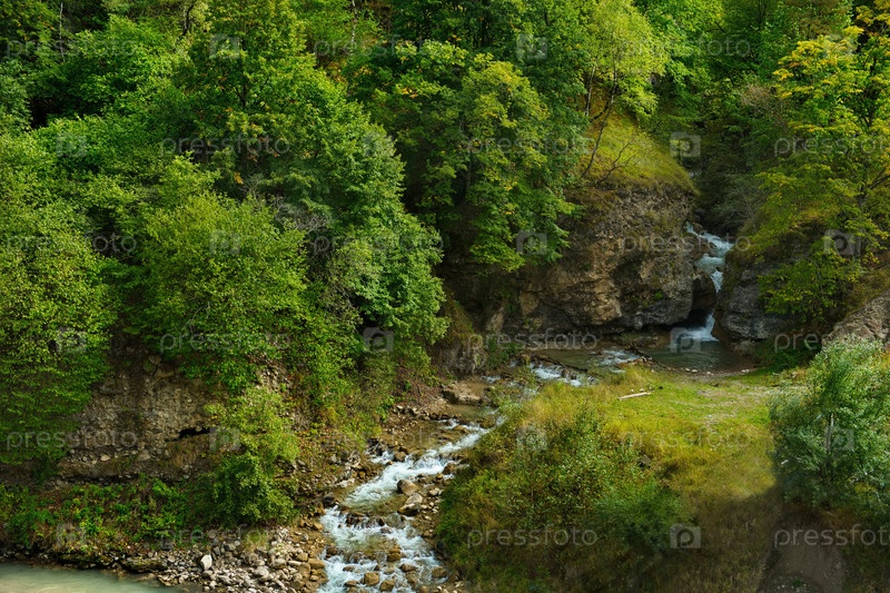 Россия. Кабардино-Балкария. Вид горную реку Малка с мутными от таяния высокогорных ледников Северного Кавказа
