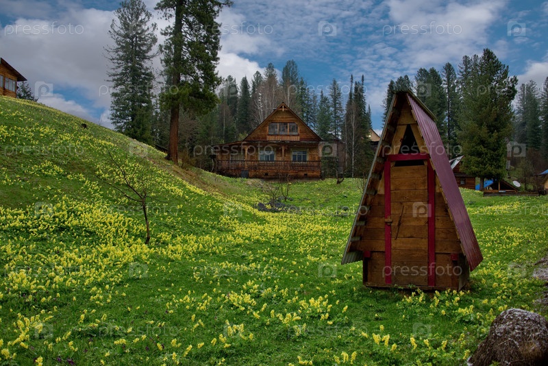 Россия, Сибирь, Кузнецкий Алатау. Тайга у дачного поселка в окружении цветущих весенних первоцветов