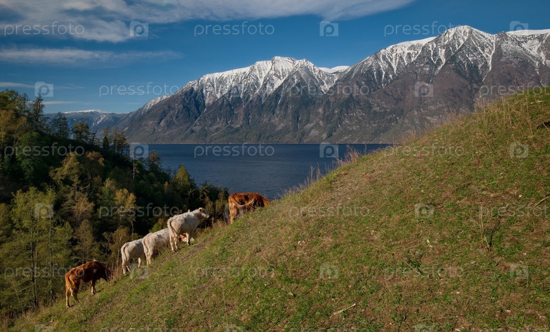 Россия. Юг Западной Сибири, горный Алтай. Небольшое стадо разнопородистых коров мирно пасутся на крутых склонах вдоль Южного берега Телецкого озера