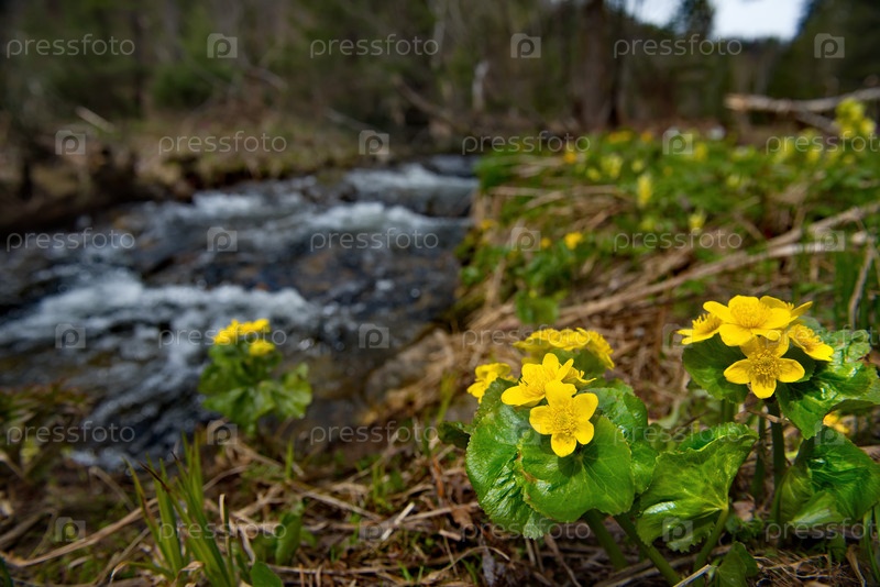 Россия, Сибирь, Кузнецкий Алатау. Тайга у дачного поселка в окружении цветущих весенних первоцветов