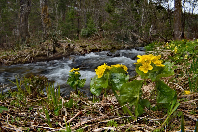 Россия, Сибирь, Кузнецкий Алатау. Тайга у дачного поселка в окружении цветущих весенних первоцветов
