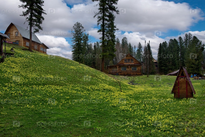 Россия, Сибирь, Кузнецкий Алатау. Тайга у дачного поселка в окружении цветущих весенних первоцветов
