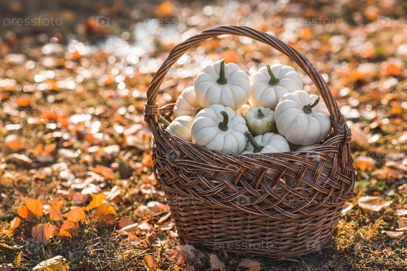 Осенний фон из белых декоративных тыкв в плетеной корзине. Богатый урожай. Концепция праздника Хэллоуин или День благодарения