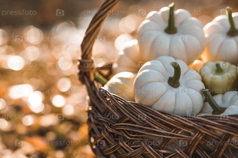 Осенний фон из белых декоративных тыкв в плетеной корзине. Богатый урожай. Концепция праздника Хэллоуин или День благодарения