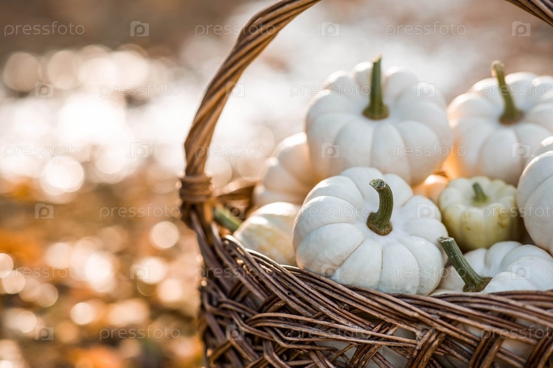 Осенний фон из белых декоративных тыкв в плетеной корзине. Богатый урожай. Концепция праздника Хэллоуин или День благодарения