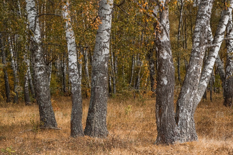 Красивый осенний пейзаж. Русская природа и культура. Фон берез, текстура древесины. Береза с падающими листьями поздней осенью