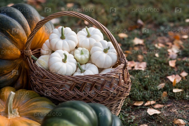 Осенний тыквенный фон. Белые тыквы в плетеной корзине. Богатый урожай. Концепция праздника Хэллоуин или День благодарения