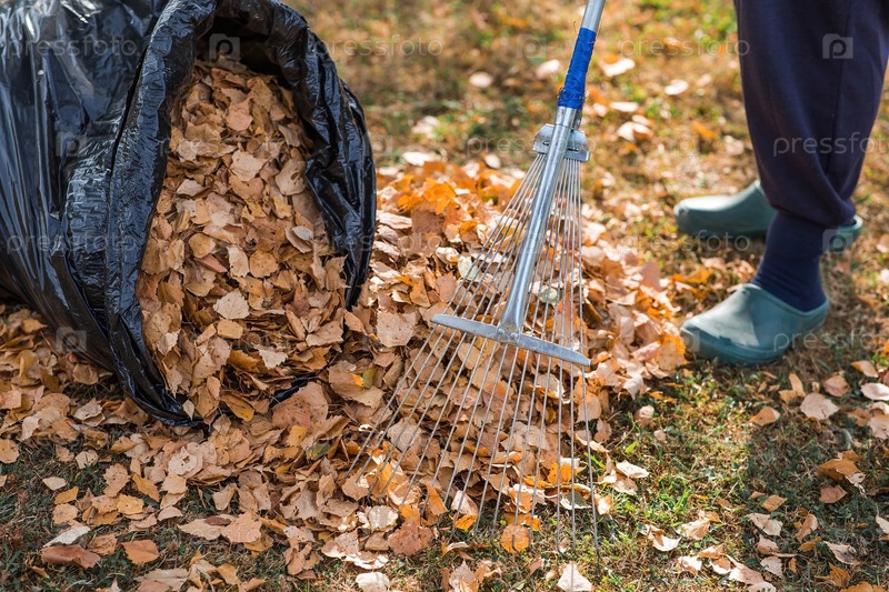 Куча осенних листьев и женщина делает генеральную уборку в саду. Осенью люди чистят газон от сухих листьев. Садоводство. Уборка сада