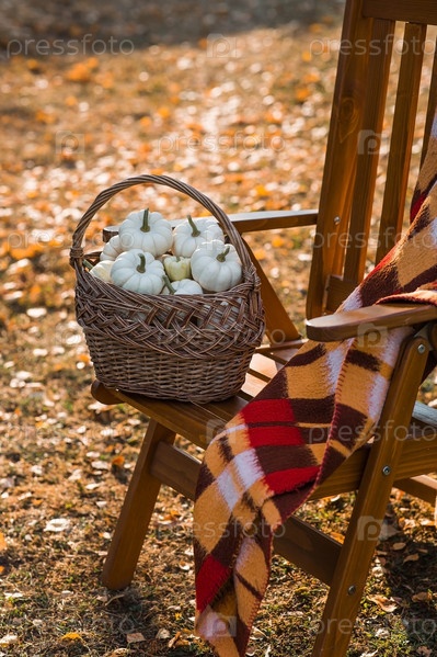Осенний фон из белых декоративных тыкв в плетеной корзине. Богатый урожай. Концепция праздника Хэллоуин или День благодарения