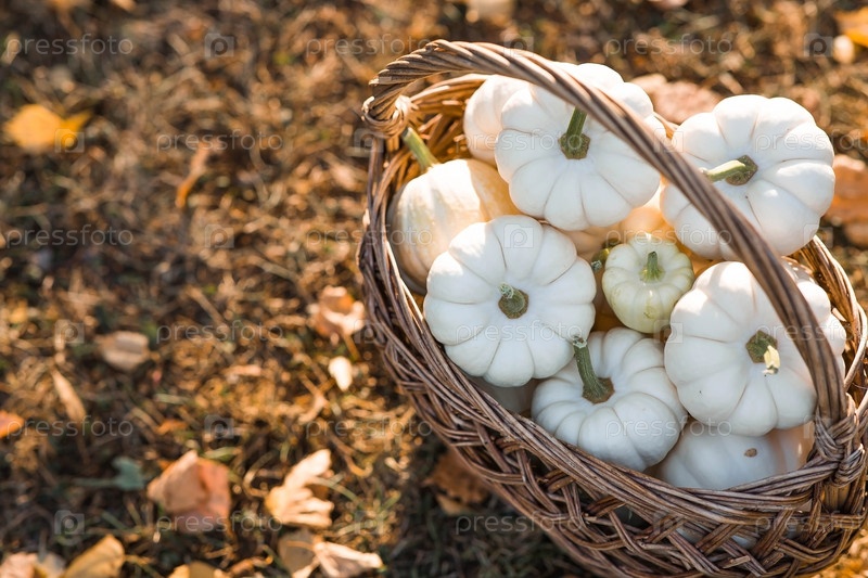 Осенний фон из белых декоративных тыкв в плетеной корзине. Богатый урожай. Концепция праздника Хэллоуин или День благодарения
