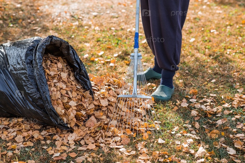 Куча осенних листьев и женщина делает генеральную уборку в саду. Осенью люди чистят газон от сухих листьев. Садоводство. Уборка сада