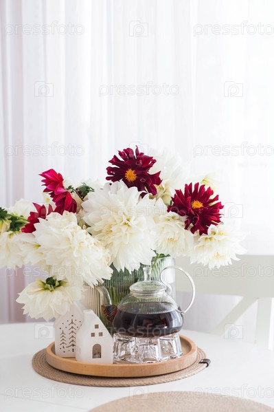 Натюрморт. Белые и красные георгины в вазе, чайник и белые домики на белом столе в интерьере домашней кухни. Уютная осенняя концепция