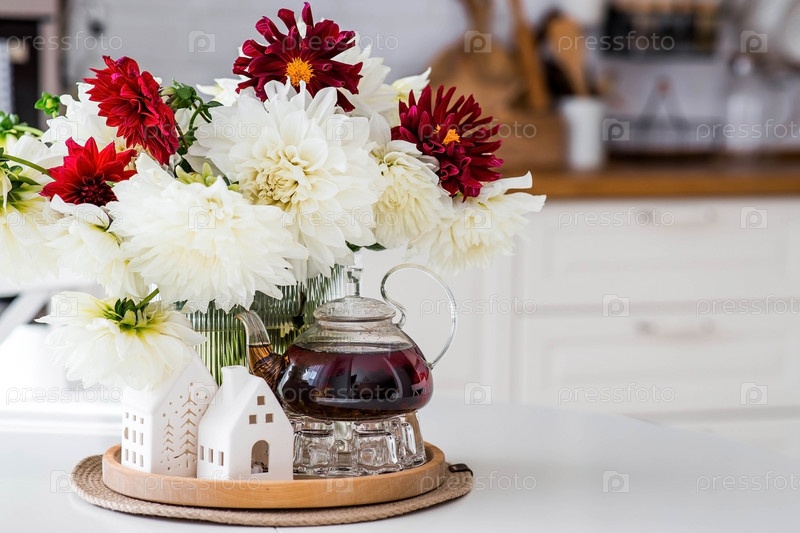 Натюрморт. Белые и красные георгины в вазе, чайник и белые домики на белом столе в интерьере домашней кухни. Уютная осенняя концепция