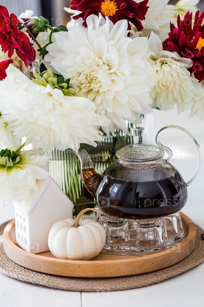 Натюрморт. Белые и красные георгины в вазе, чайник, тыква и дом на белом столе в интерьере домашней кухни. Уютная осенняя концепция