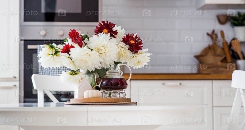 Натюрморт. Белые и красные георгины в вазе, чайник, тыква и дом на белом столе в интерьере домашней кухни. Уютная осенняя концепция