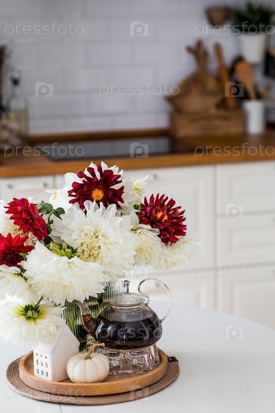 Натюрморт. Белые и красные георгины в вазе, чайник, тыква и дом на белом столе в интерьере домашней кухни. Уютная осенняя концепция