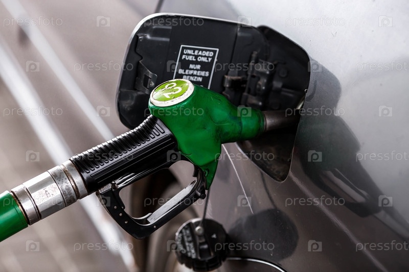 АЗС. Заправка автомобиля бензином. Российский топливораздаточный пистолет в топливном баке автомобиля на АЗС. Рост цен на топливо по всему миру