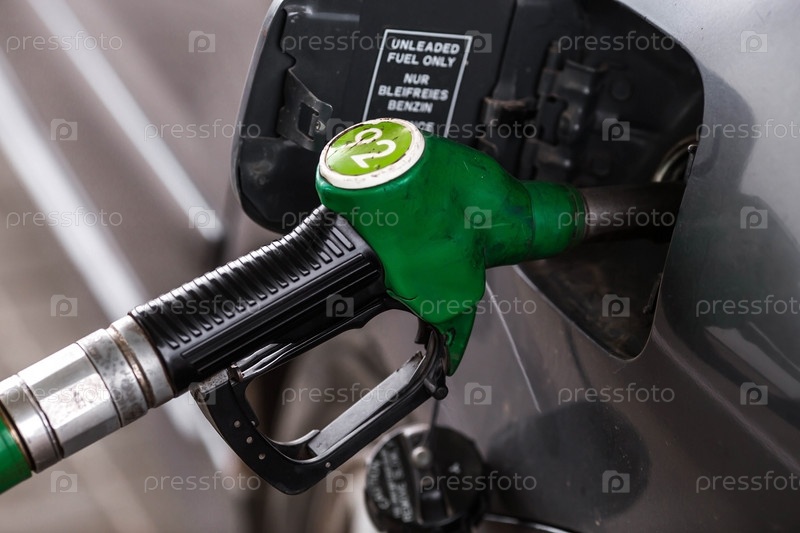 АЗС. Заправка автомобиля бензином. Российский топливораздаточный пистолет в топливном баке автомобиля на АЗС. Рост цен на топливо по всему миру