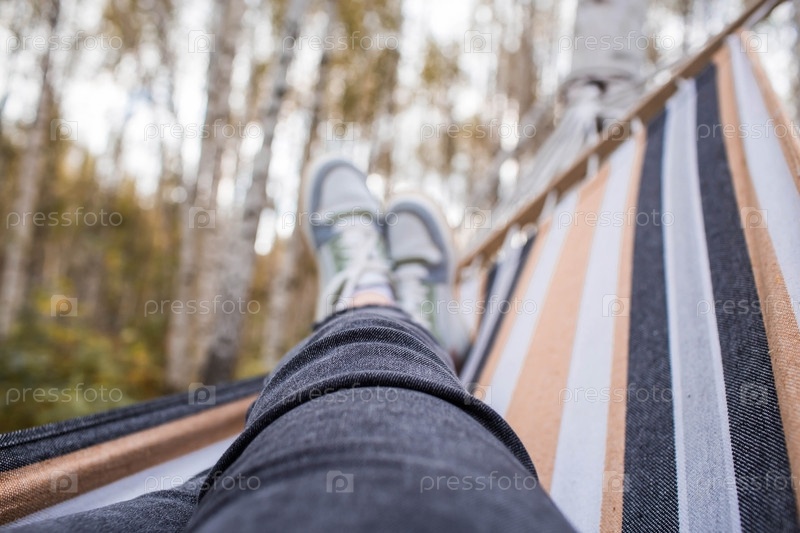 Отдых на природе. Женские ноги, обутые в кроссовки, в гамаке в осеннем лесу. Концепция уютного осеннего отпуска