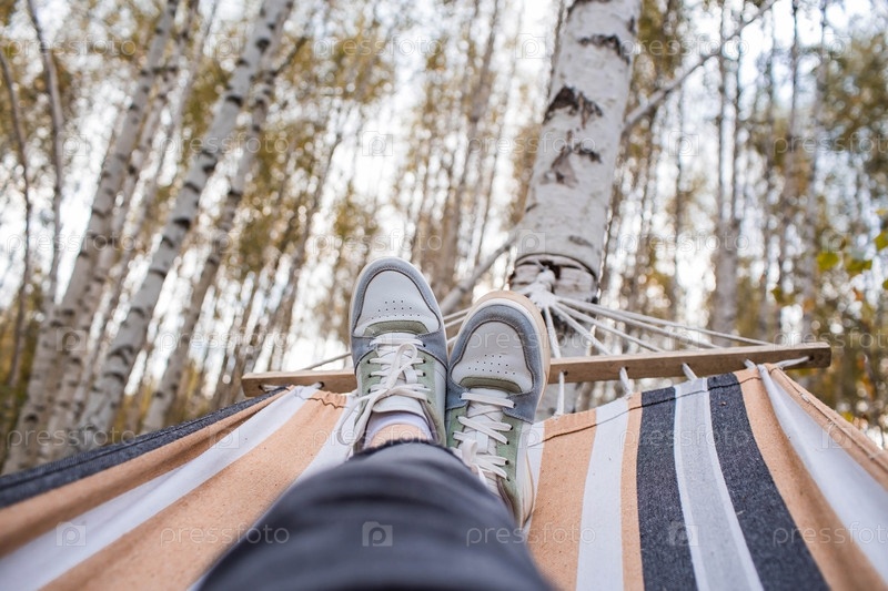 Отдых на природе. Женские ноги, обутые в кроссовки, в гамаке в осеннем лесу. Концепция уютного осеннего отпуска