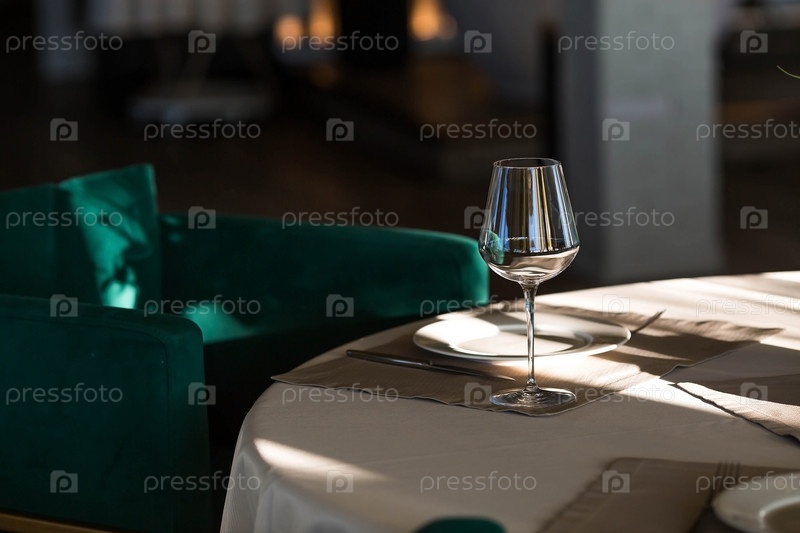Стильная сервировка стола. Стеклянные бокалы, тарелки, столовые приборы на столе. Свадебный сервиз, прием за обеденным столом. День рождения, крещение, праздничное мероприятие