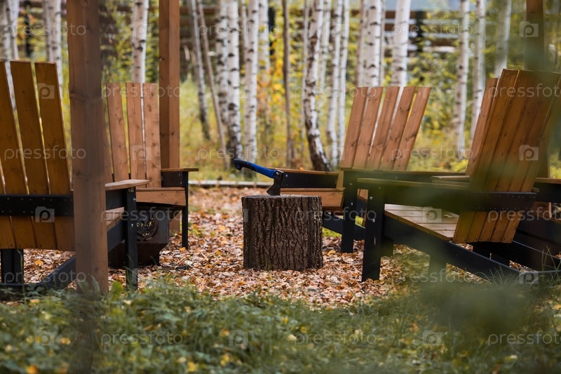 Экологичная, стильная зона барбекю и деревянные стулья для отдыха у костра. Топор будет воткнут в деревянное полено. Колка дров