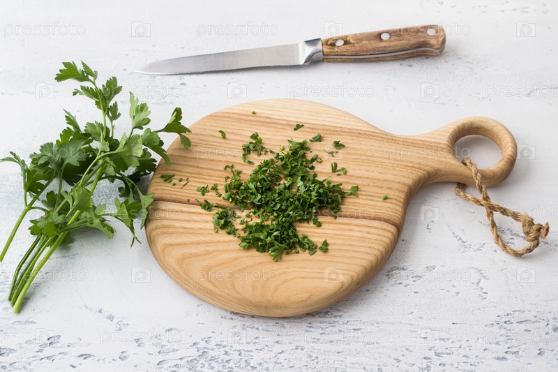 Деревянная доска с рубленой петрушкой, пучок свежей петрушки, нож на светло-голубом фоне