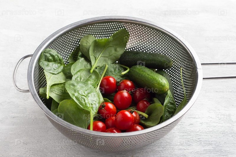Свежие промытые листья шпината, помидоры черри и огурцы в дуршлаге на светло-сером фоне. Готовим полезный домашний салат
