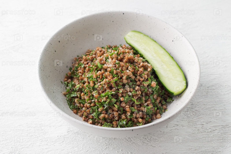 Белая миска с вареной гречкой и капустой на сером фоне, подается со свежим огурцом. Здоровая домашняя веганская еда