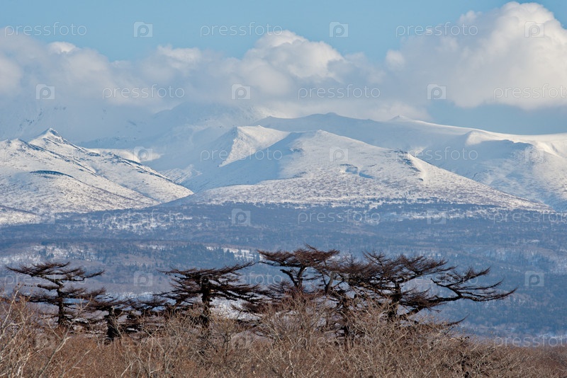 Россия, Дальний Восток, Курильские острова. Причудливые лиственницы и корявые каменные березы в окружении бамбука на фоне заснеженных вершин вулканов