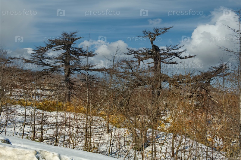 Россия, Дальний Восток, Курильские острова. Причудливые лиственницы и корявые каменные березы в окружении бамбука на фоне заснеженных вершин вулканов