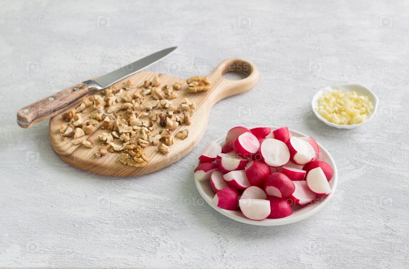 Вегетарианский салат ингредиенты: нарезанный редис, рубленые грецкие орехи, измельченный чеснок на светло-сером фоне. Концепция приготовления вегетарианской домашней еды