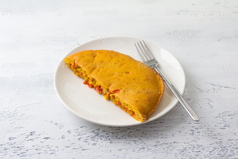 Веганский омлет из нута с болгарским перцем на светло-сером текстурированном фоне. Здоровая домашняя еда