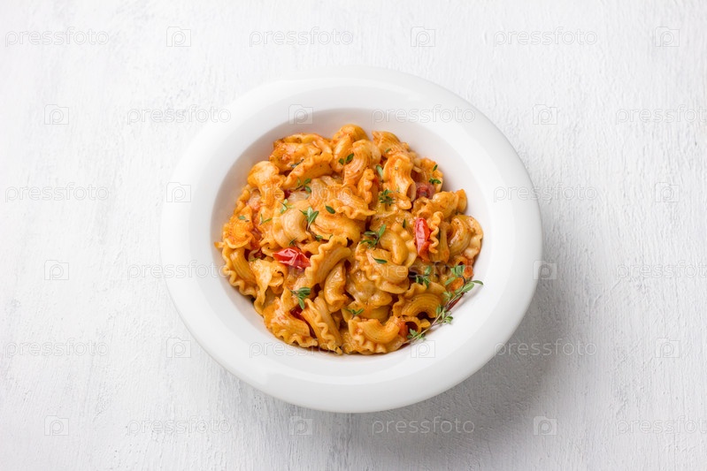 Простая паста с томатным соусом, посыпанная свежим тимьяном в белой тарелке на светло-сером фоне, вид сверху, плоская выкладка. Вкусная домашняя еда