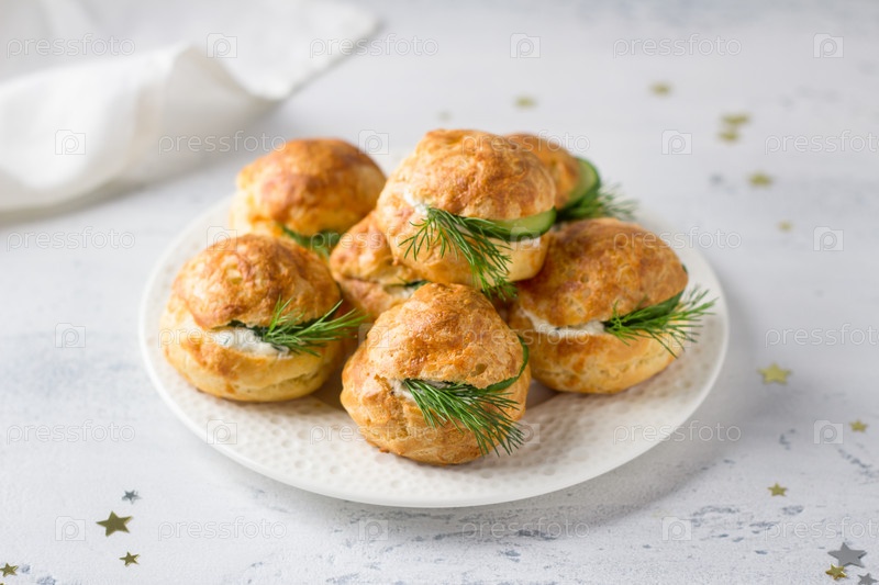 Сырные профитроли со сливочным сыром, огурцом и зеленью, гужеры, традиционная французская выпечка, в белой тарелке на светло-сером фоне