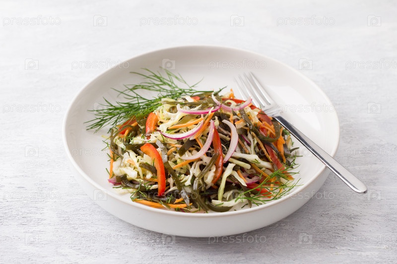 Белая тарелка с салатом из водорослей, белокочанной капусты, моркови, сладкого перца, маринованного красного лука и зелени на светло-сером фоне, вид сверху. Здоровая домашняя еда