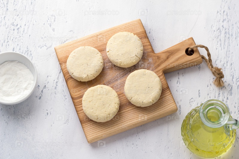 Сырые веганские сырники из тофу с рисовой мукой на деревянной доске на светло-голубом фоне, вид сверху. Этап приготовления