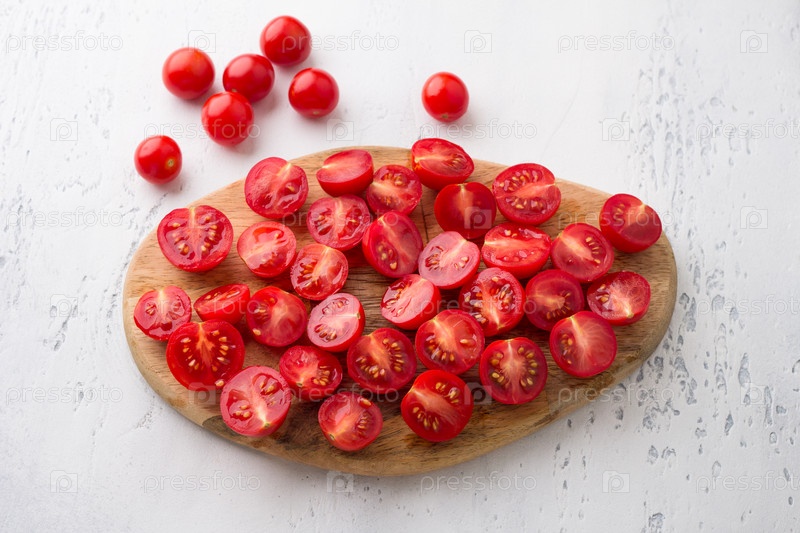 Деревянная доска с нарезанными помидорами черри на светло-голубом фоне, вид сверху. Готовим вкусную домашнюю еду