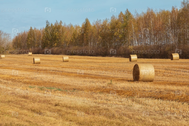 Стога соломы в поле в солнечный день. Осенний урожай сельскохозяйственных культур