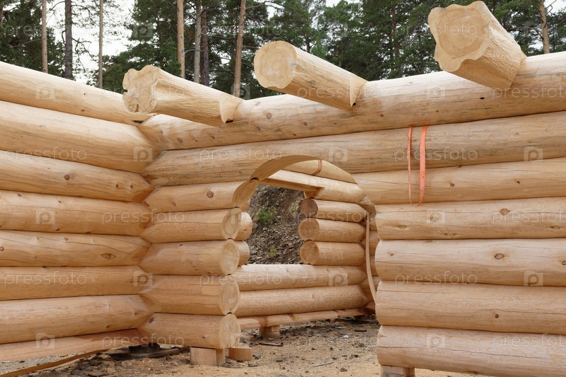 Строительная площадка деревянного дома. Традиционный сруб из бревен. Проект коттеджа