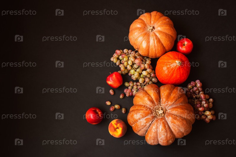 Бордюр из тыкв и свежих фруктов на темном фоне