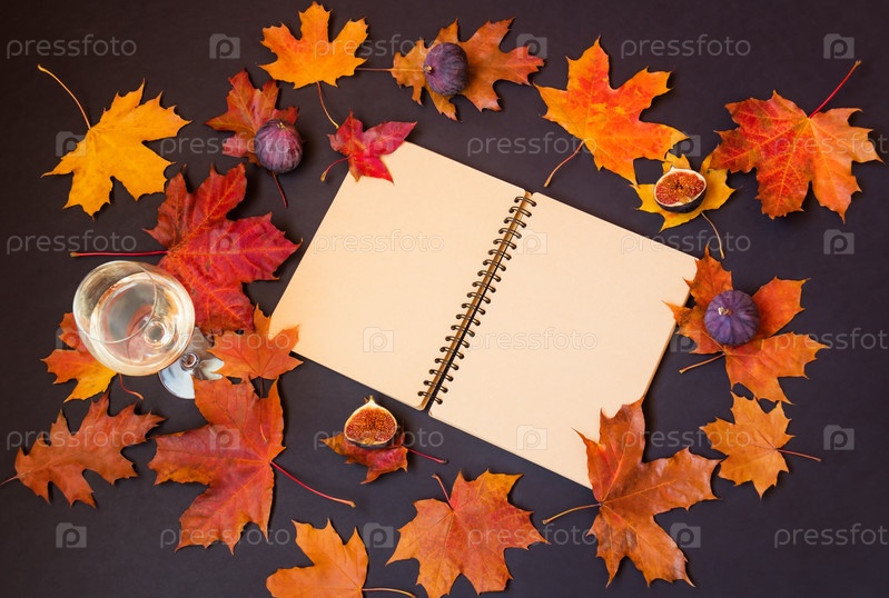 Пустой блокнот, бокал вина, инжир и осенние листья на темном фоне