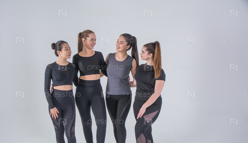 Фитнес-тренеры девушки разных национальностей - кореянки, киргизки, азиатки, русские, европейки. Спортивного телосложения позируют в студии
